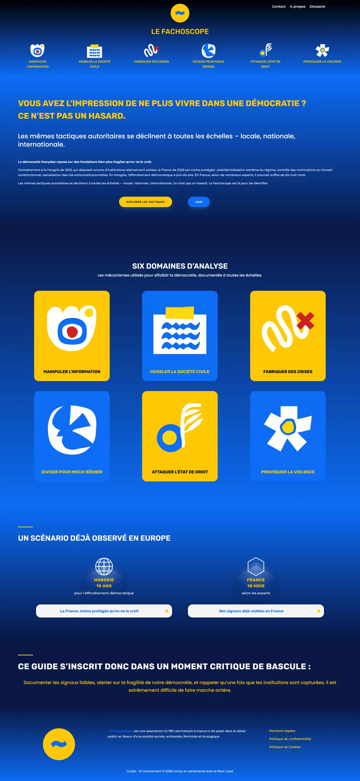 L’association avait besoin d’un outil pédagogique pour documenter les « signaux faibles », identifier les tactiques autoritaires récurrentes et alerter le public sur la rapidité potentielle de ce processus.